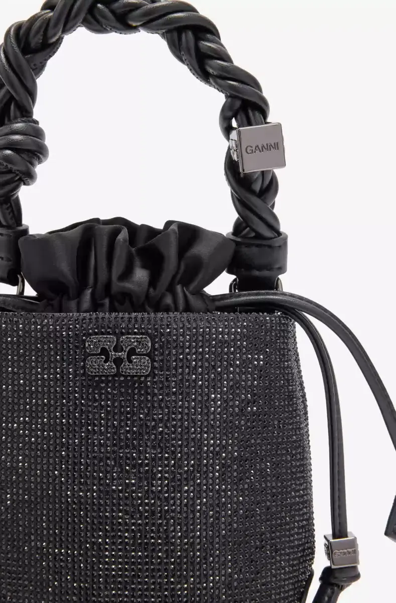 This bag features a braided top handle with knot detail and an adjustable and removable strap. The bag has a drawstring pouch, an embossed logo on the back, and an internal flat pocket