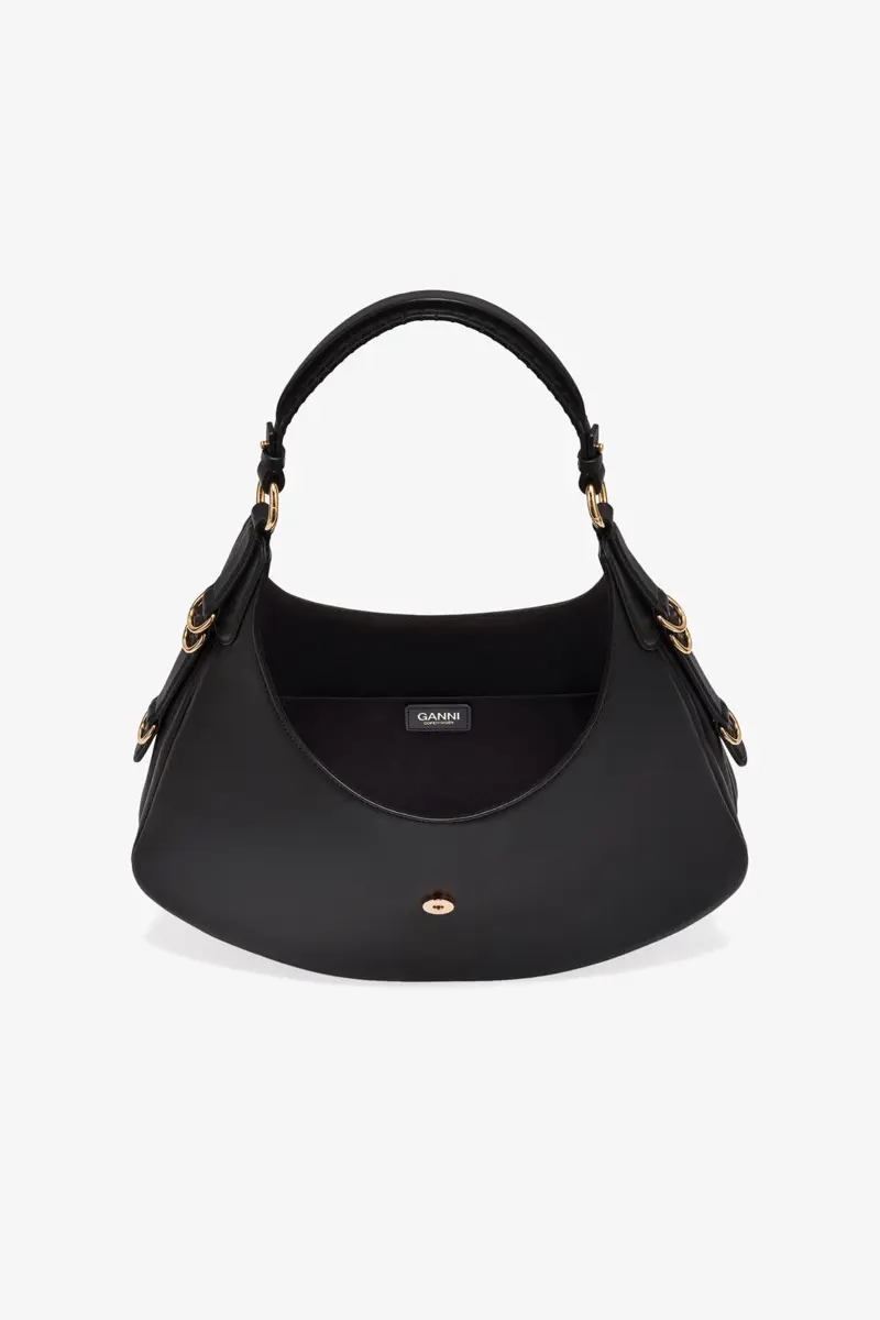 This bag features a accordian-style silhouette, a shoulder strap and D-ring detailing at the side. The bag has a closure tab with the signature GANNI Butterfly clasp in gold-tone, 1 ma