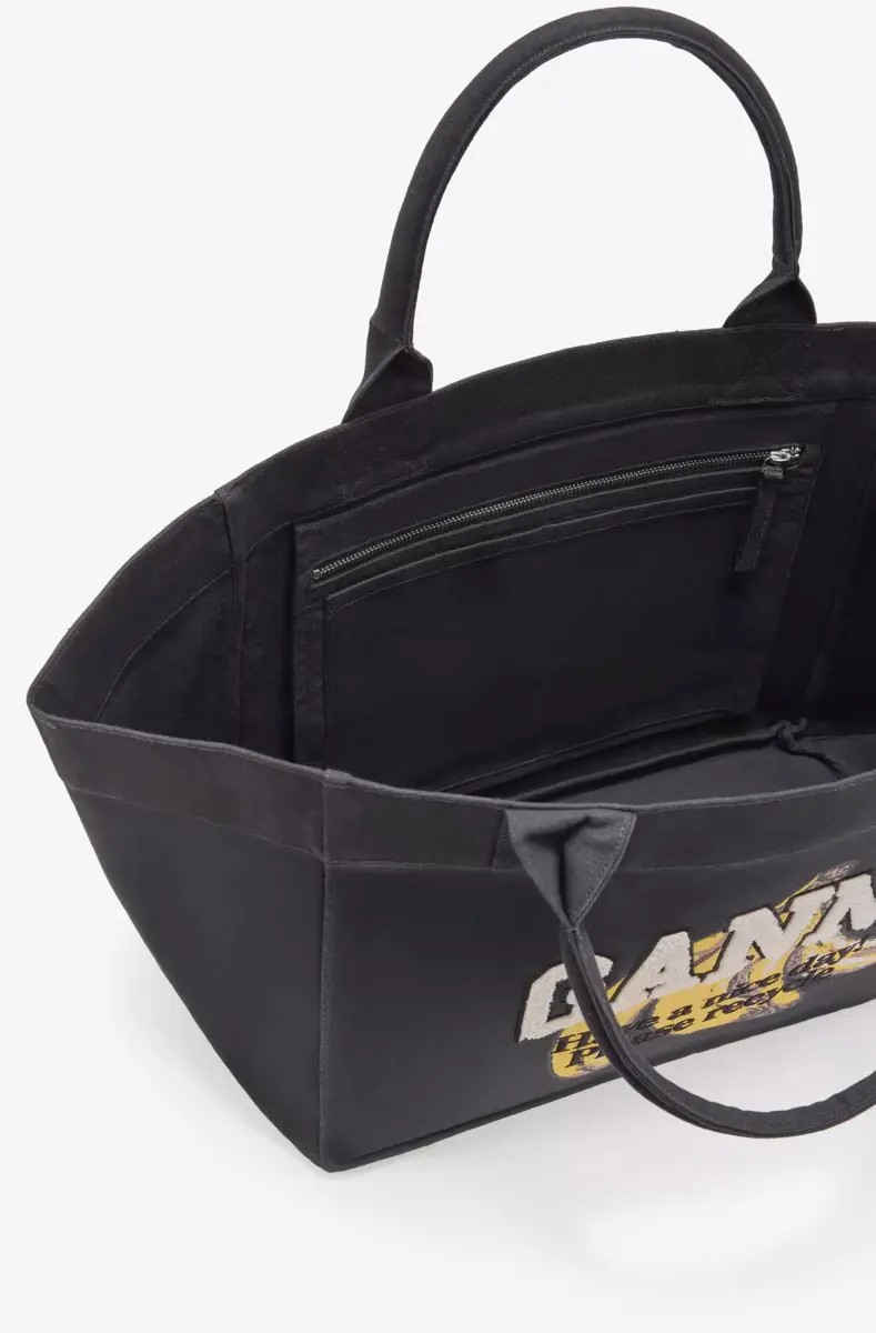 This tote bag features top handles, one large compartment, and a GANNI logo with the phrase ‘Have a nice day! Please recycle’.
