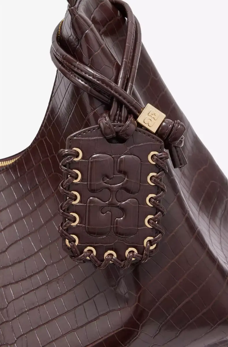 The bag is crafted in recycled leather with a croco finish featuring a mirror hangtag and logo hardware