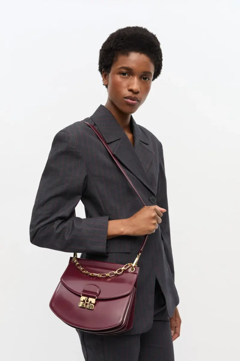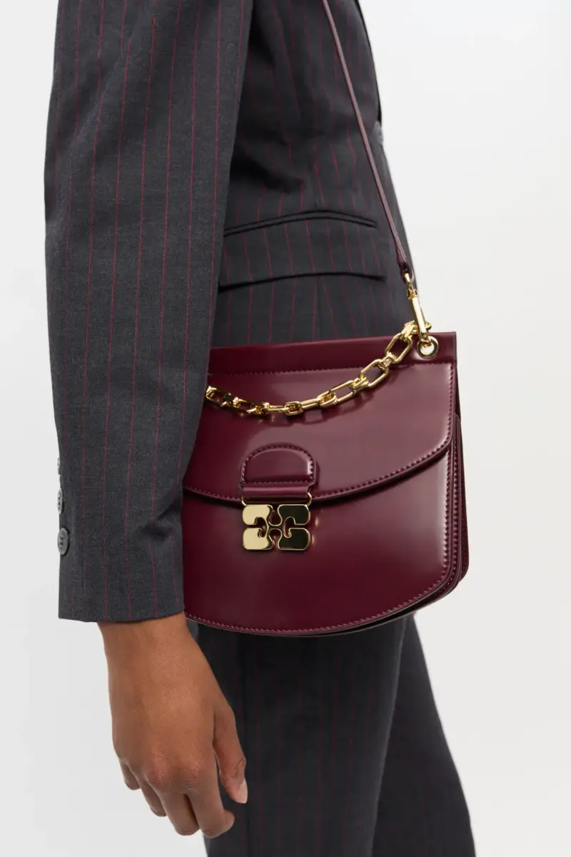 This bag features a structured silhouette, a box chain handle and an adjustable and removable shoulder strap. The bag has a magnetic closure with the signature GANNI Butterfly clasp in
