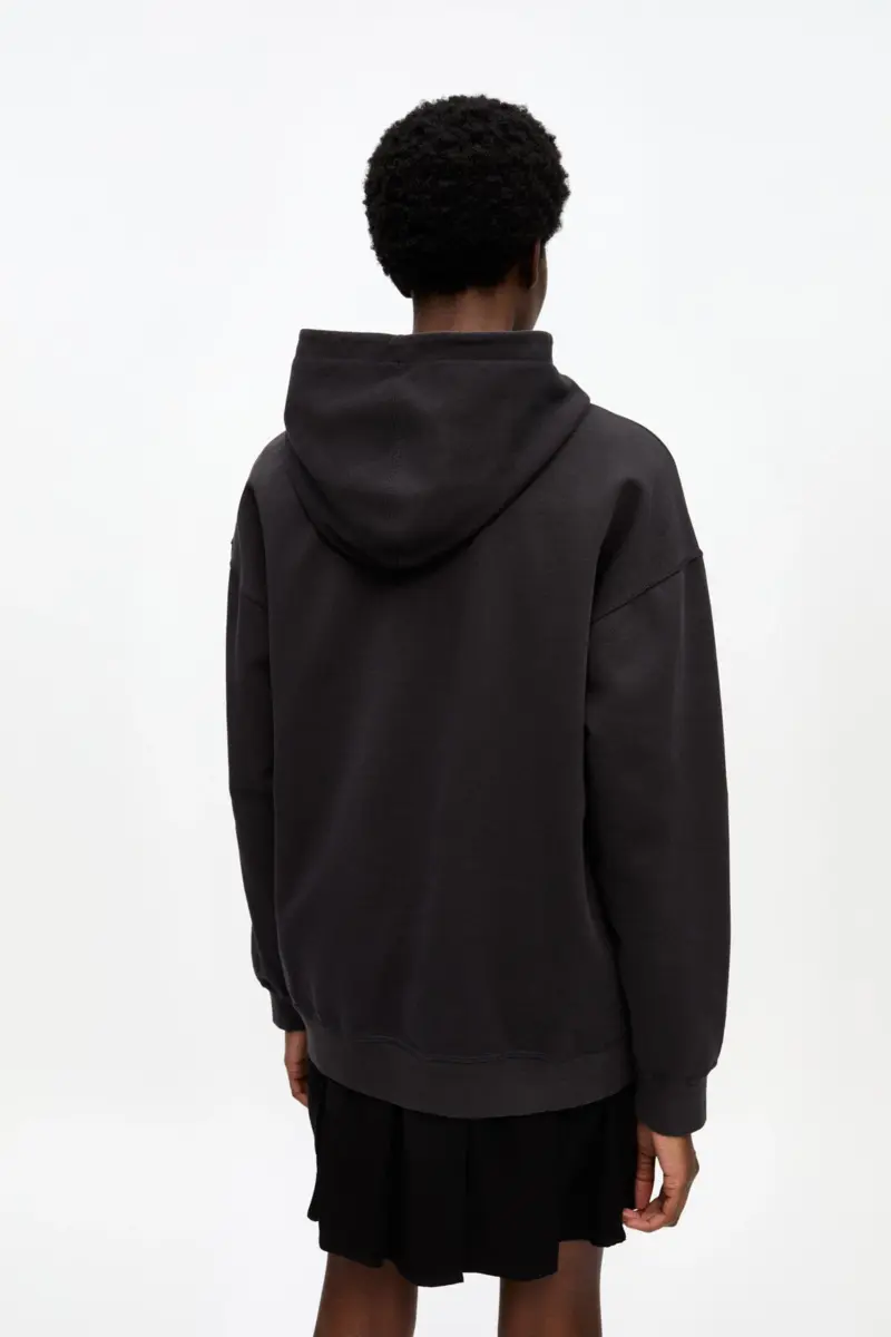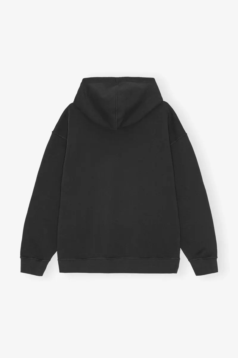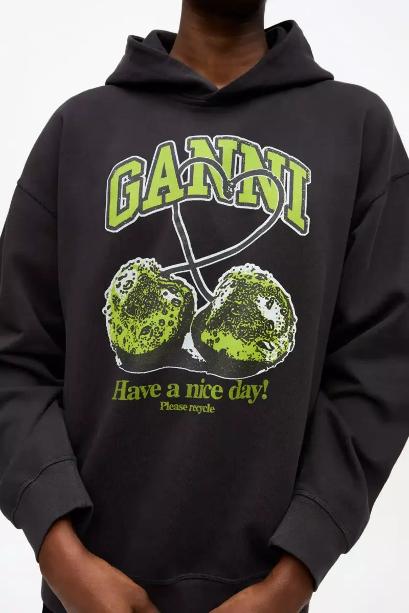 This Black Isoli Cherries Oversized Hoodie features a hood and long sleeves. The hoodie has ribbed edges and a graphic GANNI print.