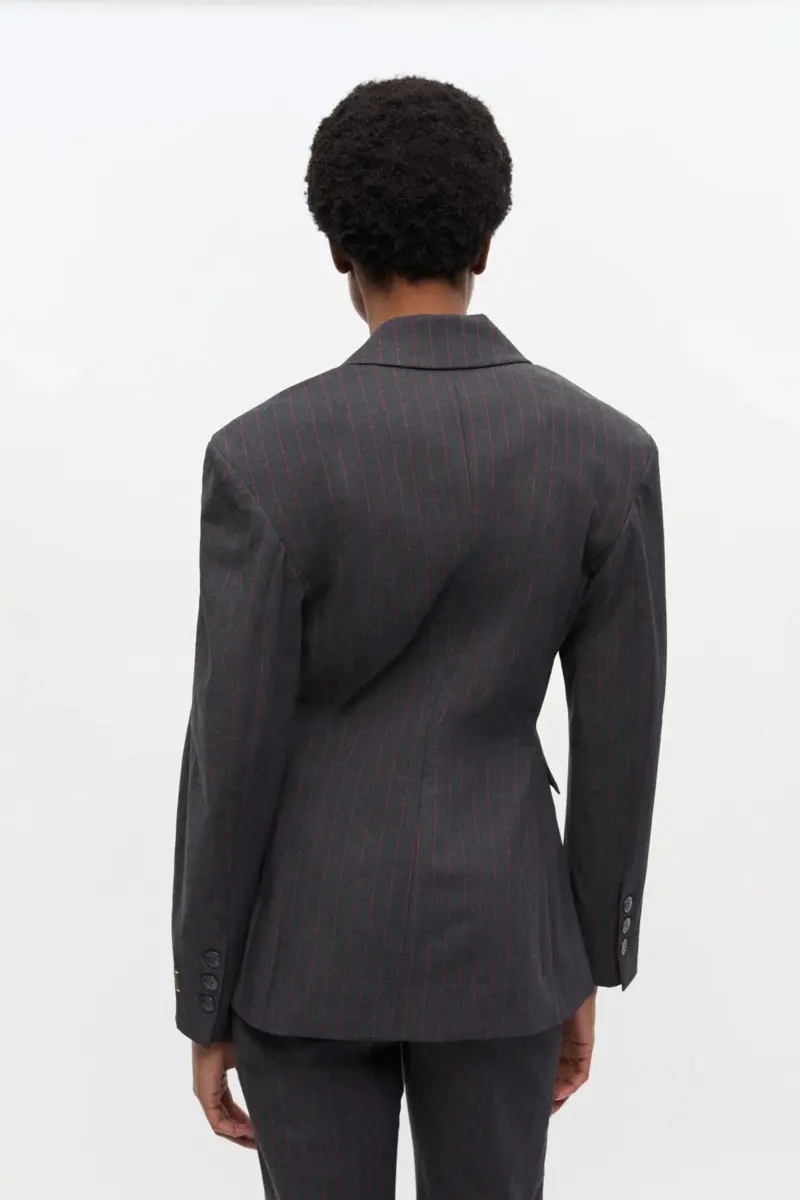 This blazer features a thin red pinstripe, a single-button closure at the front, notched lapels, two flap pockets at the waist and a GANNI patch logo.