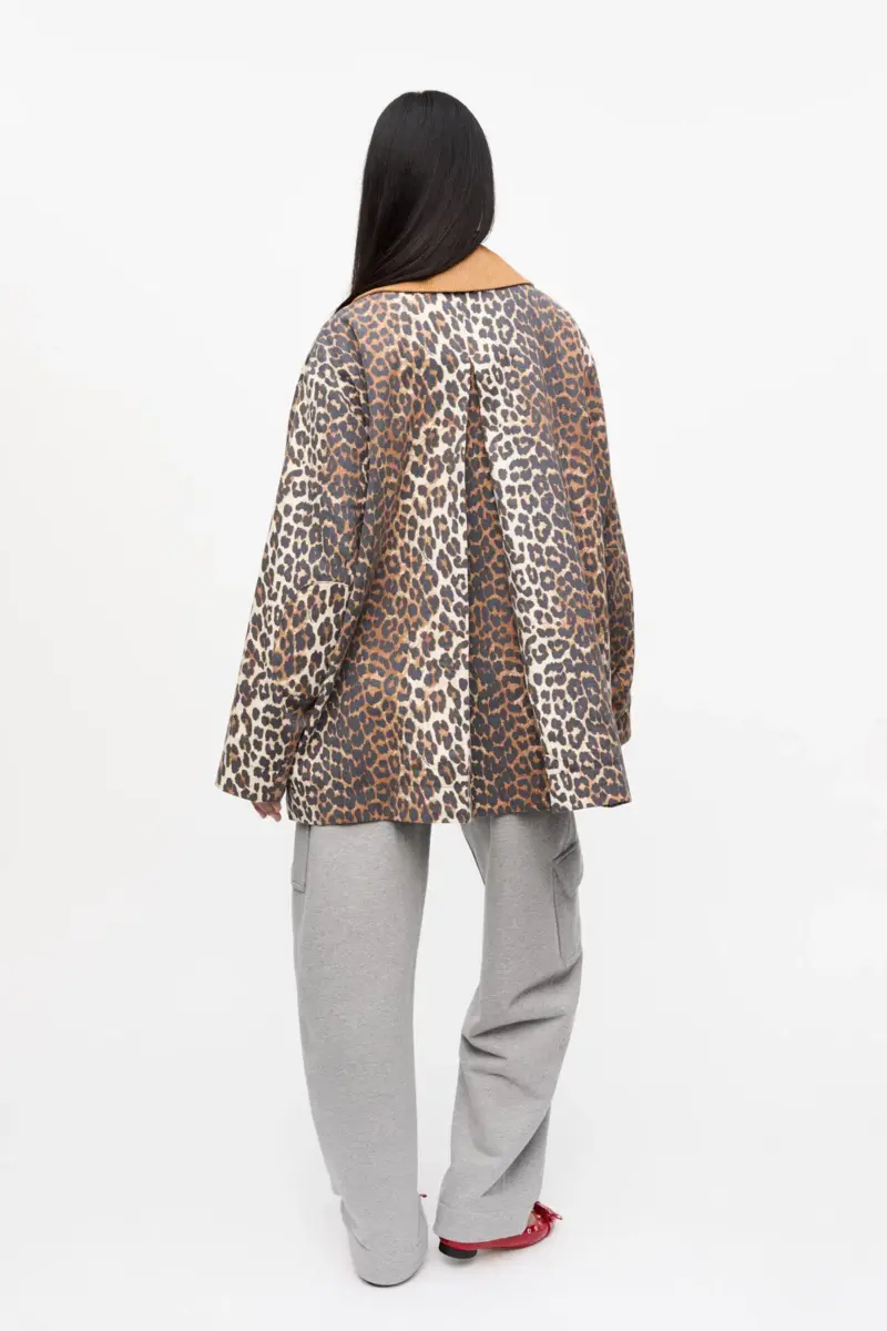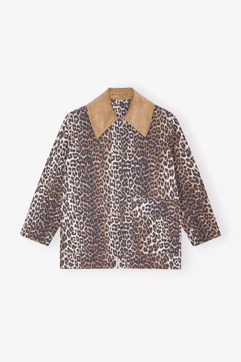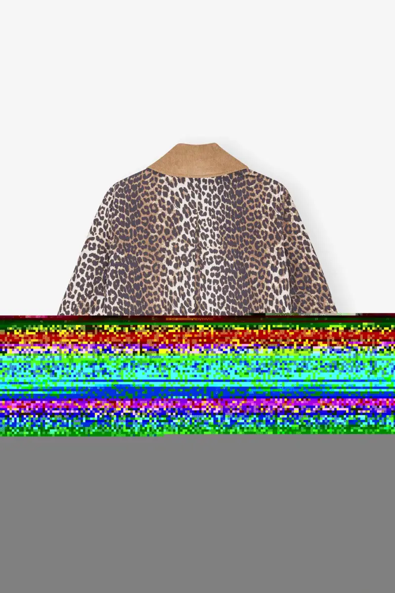 This Leopard Printed Canvas Midi Jacket is designed for a relaxed, boxy fit and features a wide corduroy collar in a contrasting camel tone. The jacket has a button closures down the f