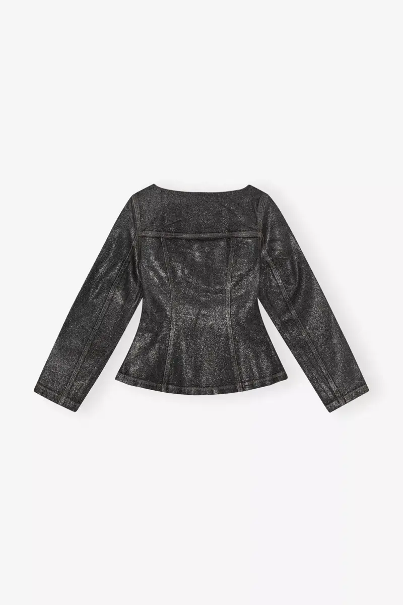 This denim blazer features a shimmery foil finish, a square neckline, button front closure and 2 chest pockets.