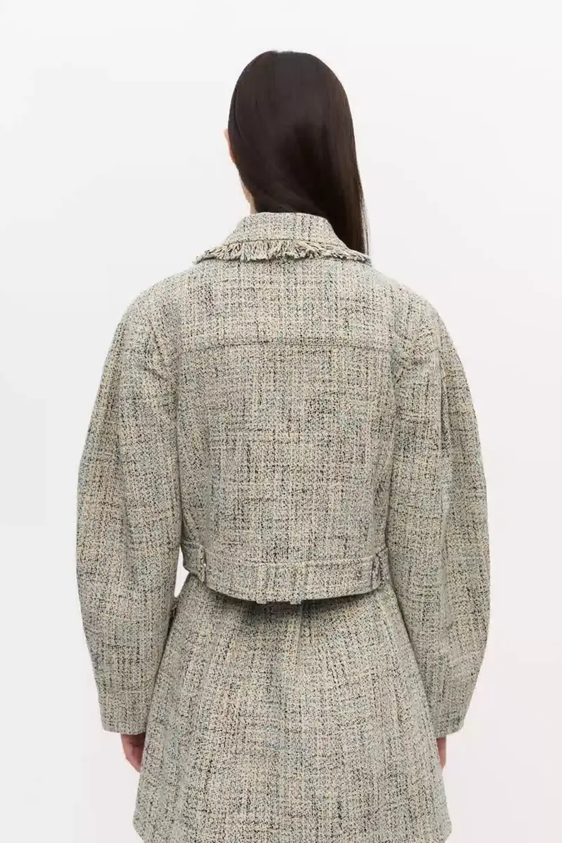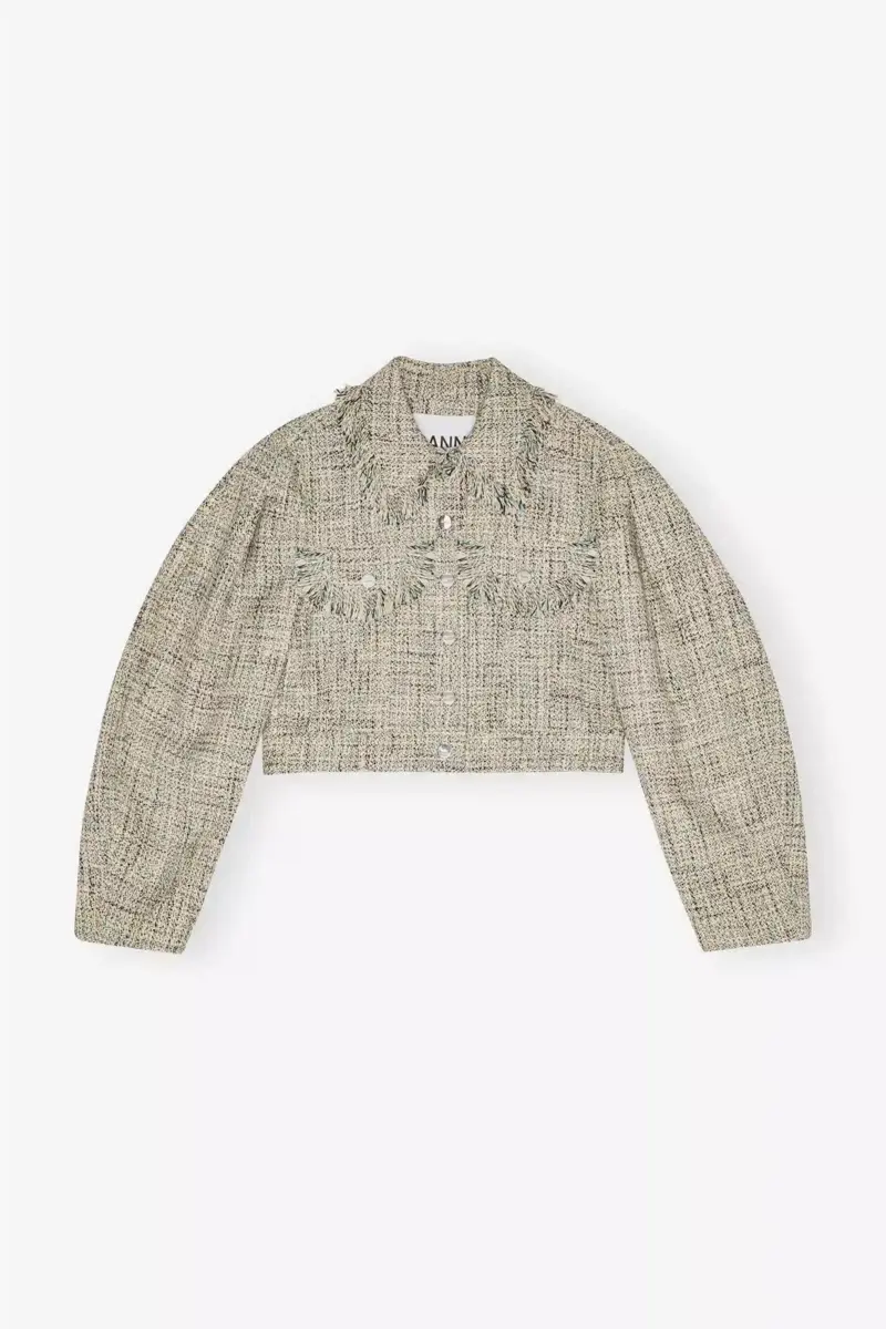 This jacket features a cropped silhouette with a button-up front. The design includes a classic collar, chest pockets and fringe detailing.