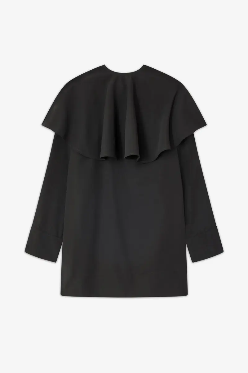 This dress features a removable circle collar, long sleeves with a wide cuff and a zipper closing at back.
