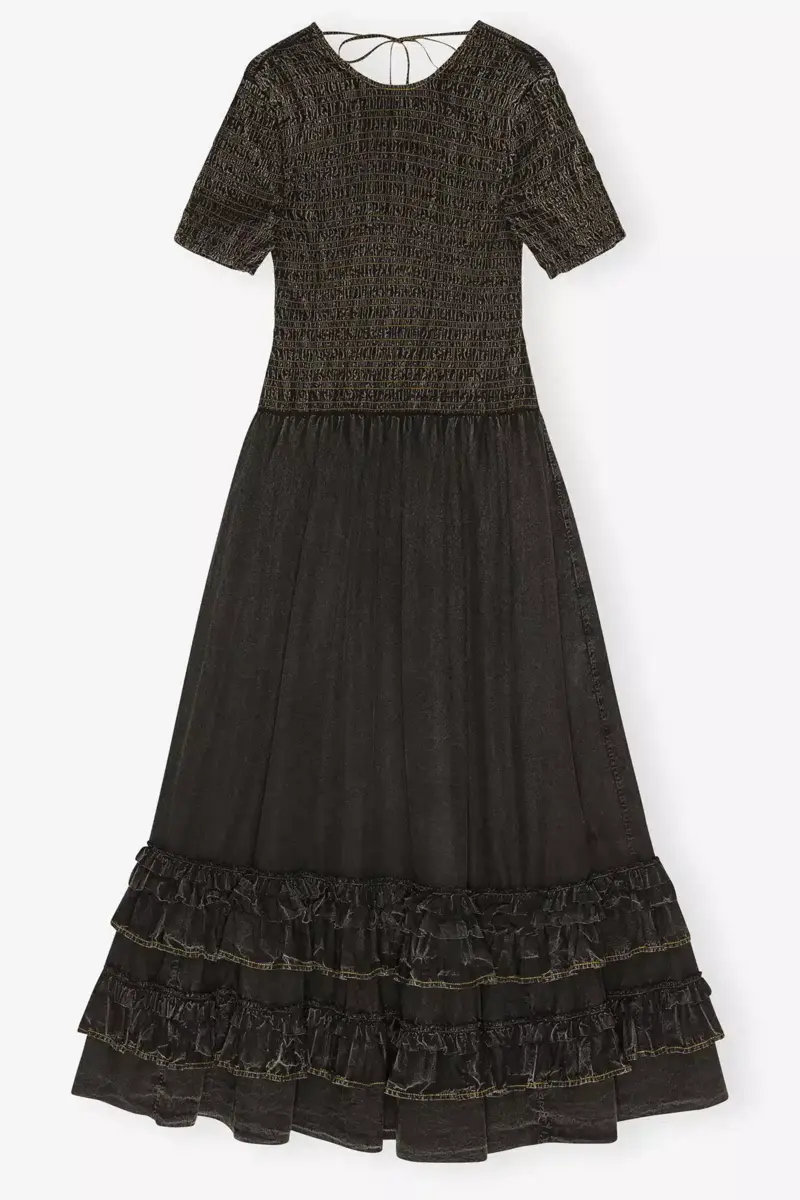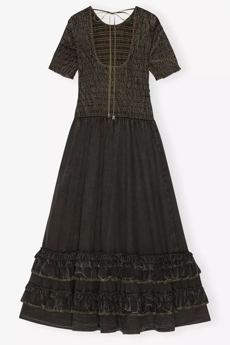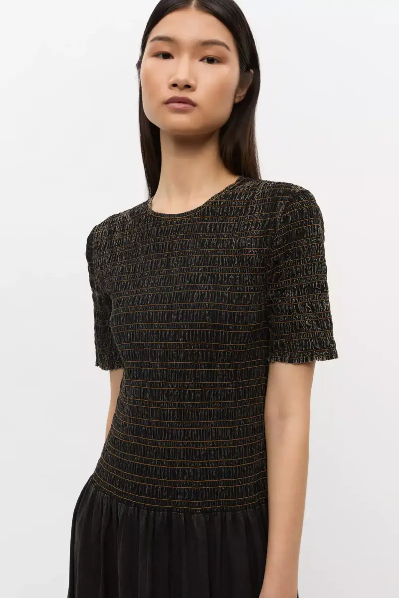 This dress features a smocked bodice with a round neckline, short sleeves and contrast stitching detailing.