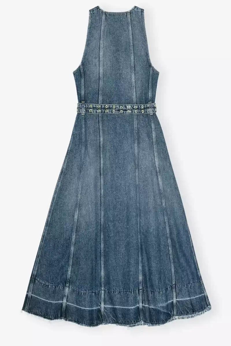 This dress in denim feature a V-neckline, button front closure, chest pockets and a matching belt with metallic eyelets.