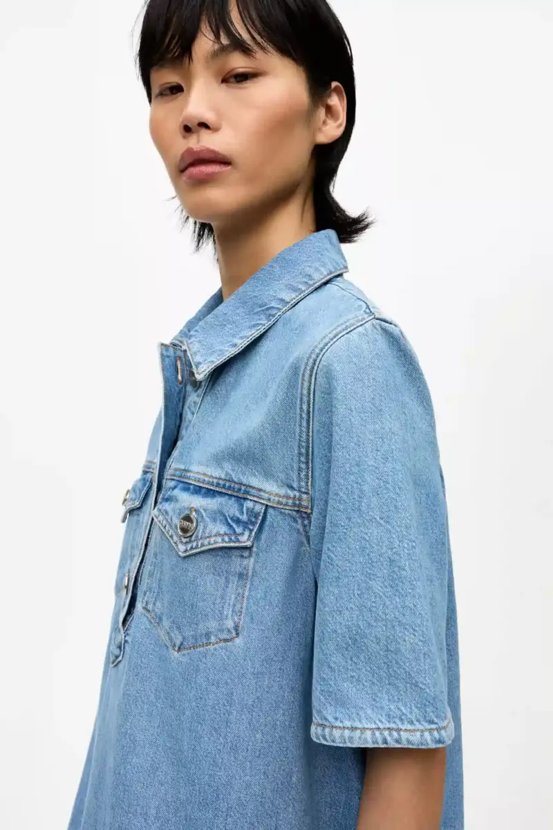 This dress features a collar, button closure, elbow-length sleeves, front pockets and broderie anglaise detailing .