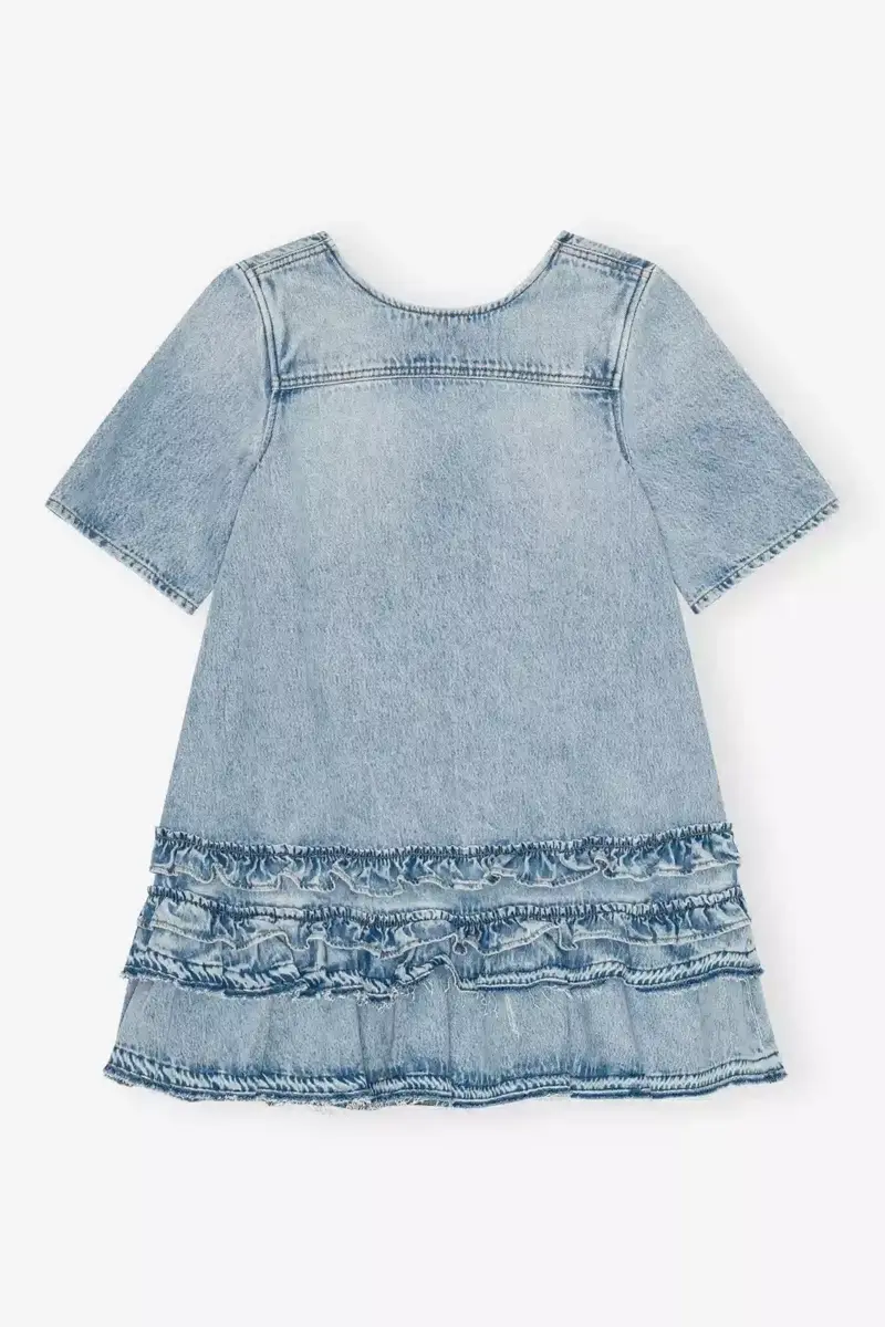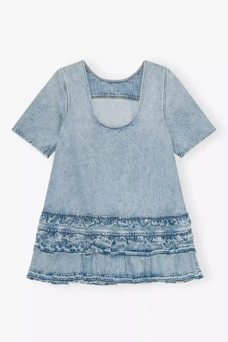 This dress features a round neckline, an open back, short sleeves, frill details and a raw hem.