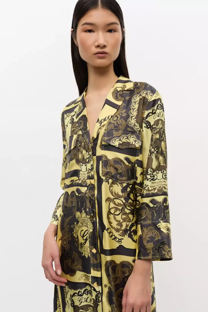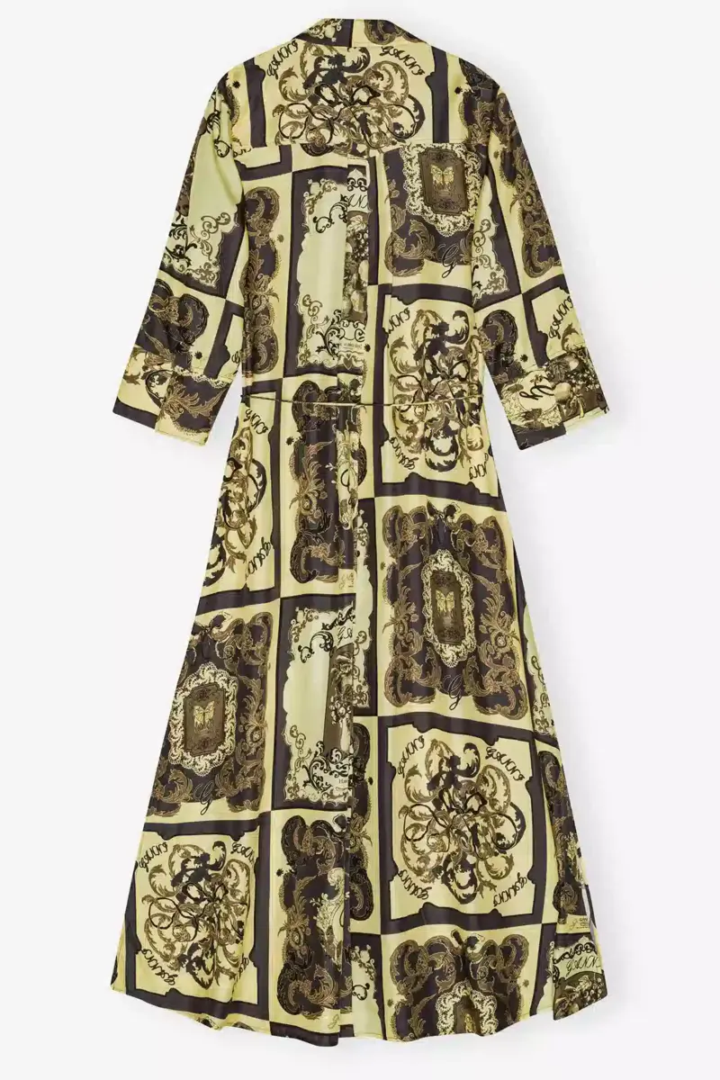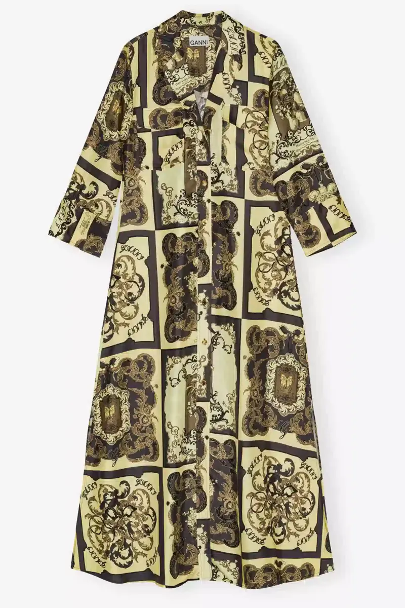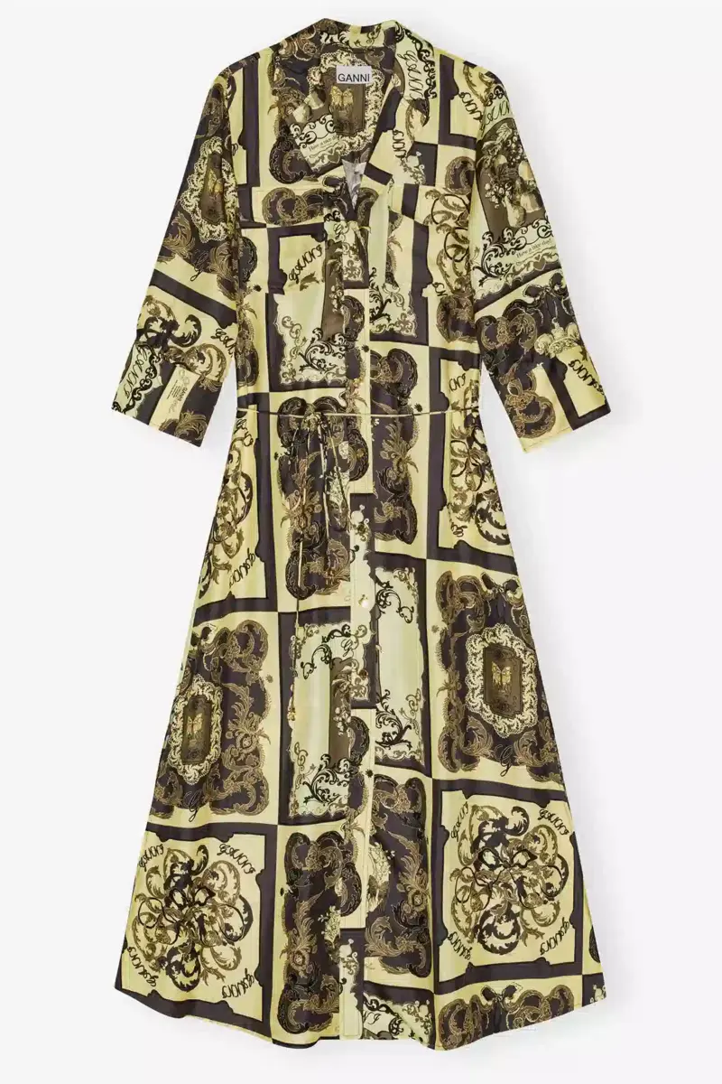 This dress features an ornate print. The dress is crafted from a silk satin fabric and has a button-down front and a matching belt.