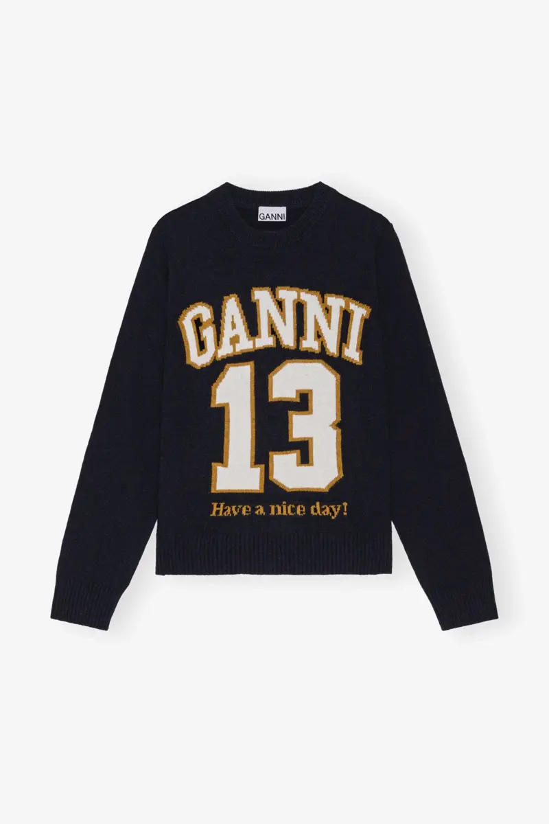 This jumper features a round neckline, a graphic GANNI motif, long sleeves and ribbed edges.