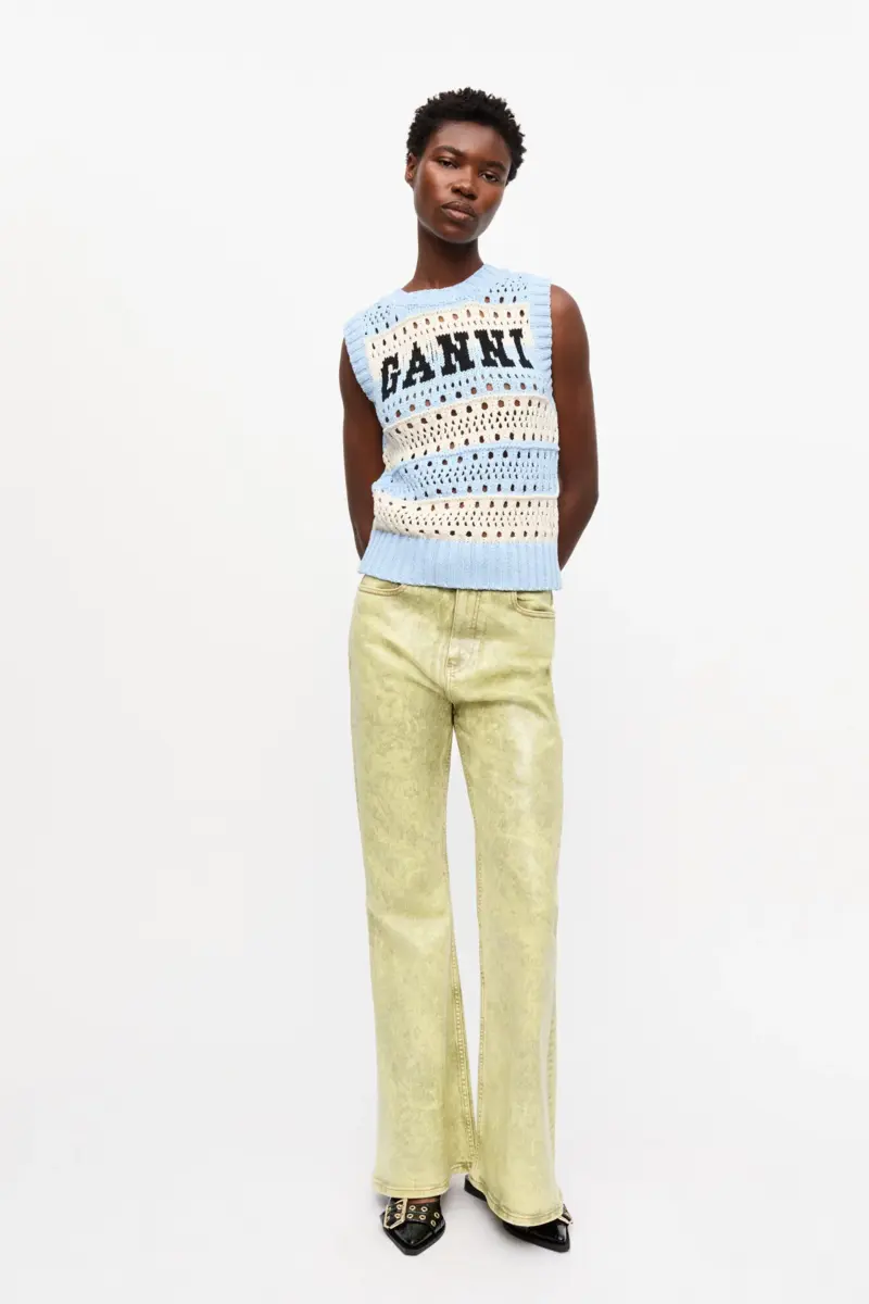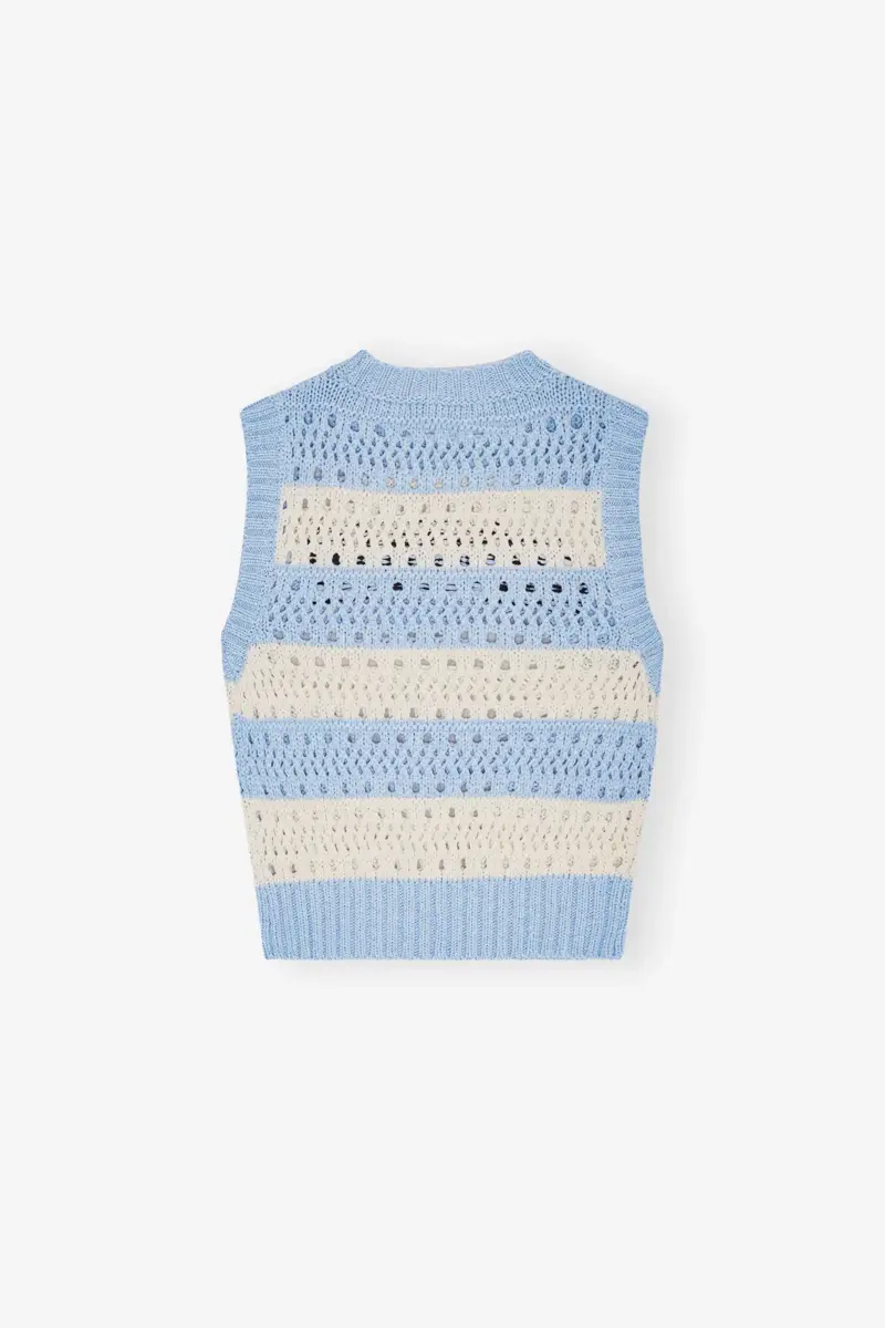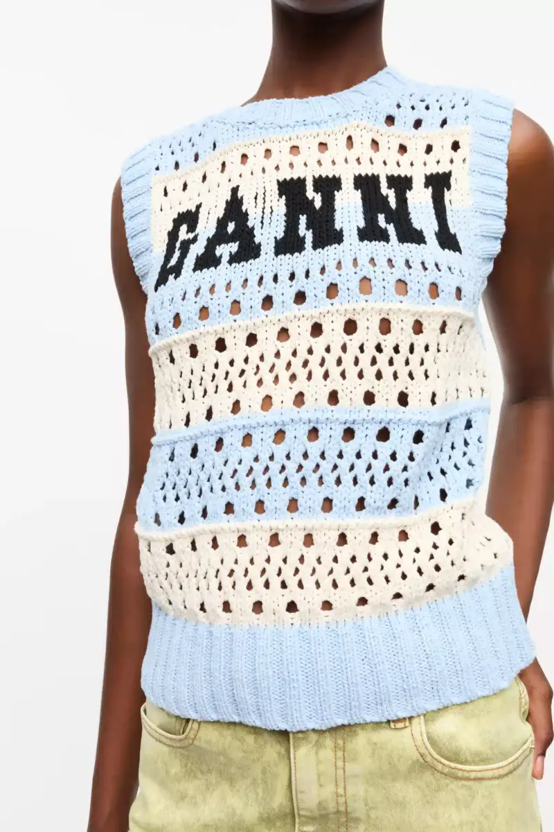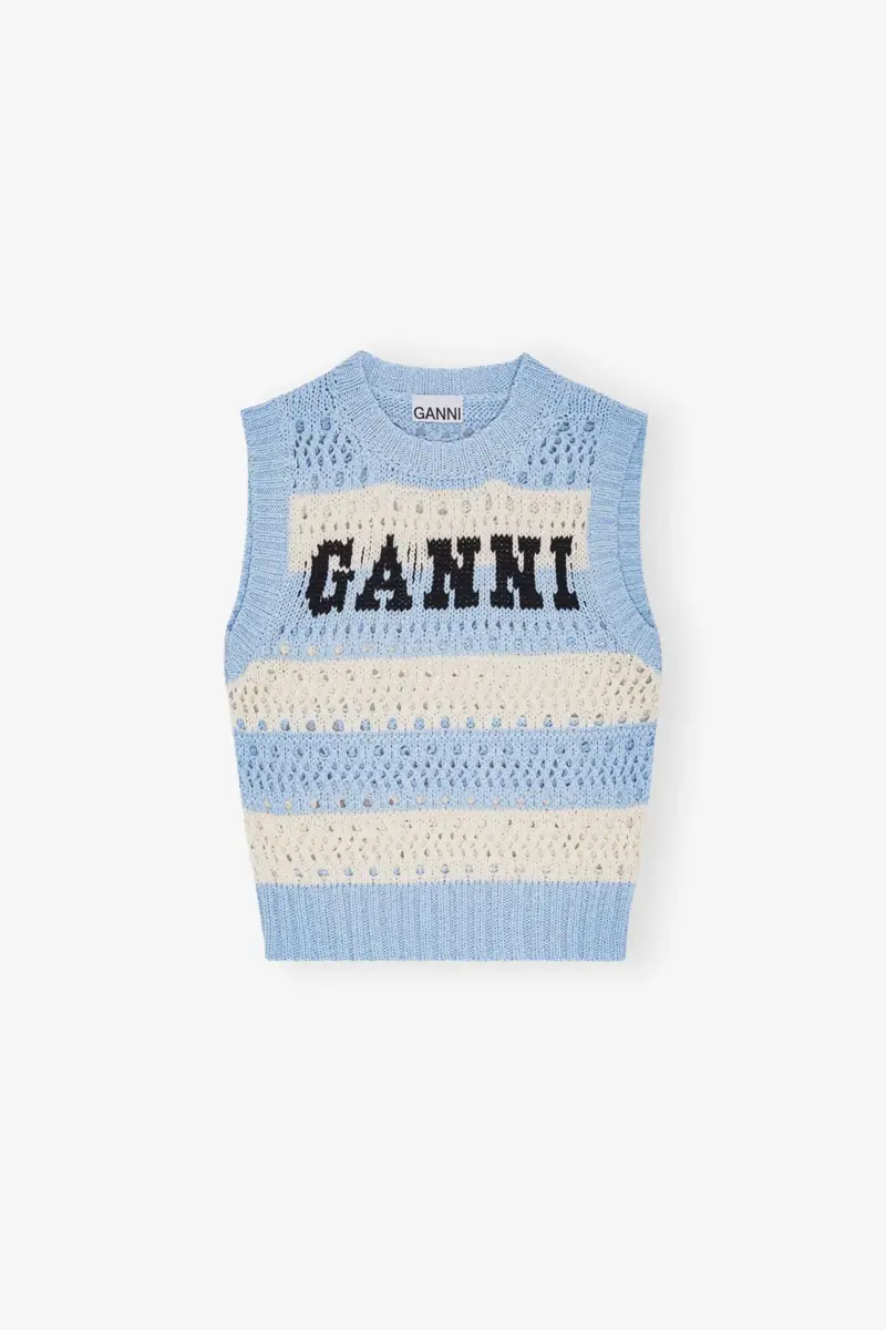 This Light Blue Striped Vest is sleeveless and features the GANNI logo.
