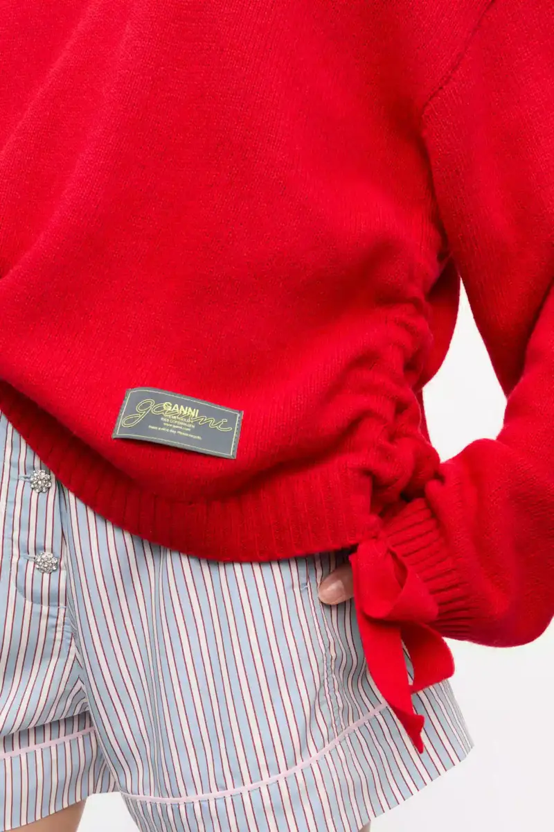 This jumper features a round neckline, long loose sleeves, ribbed edges, ruched detailing on the sides with tie details and a sewn-on GANNI logo patch.