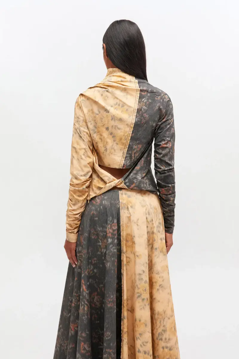 This top in a split romantic floral print features an asymmetrical neckline, ruching at sleeves and a twisted open back detail.