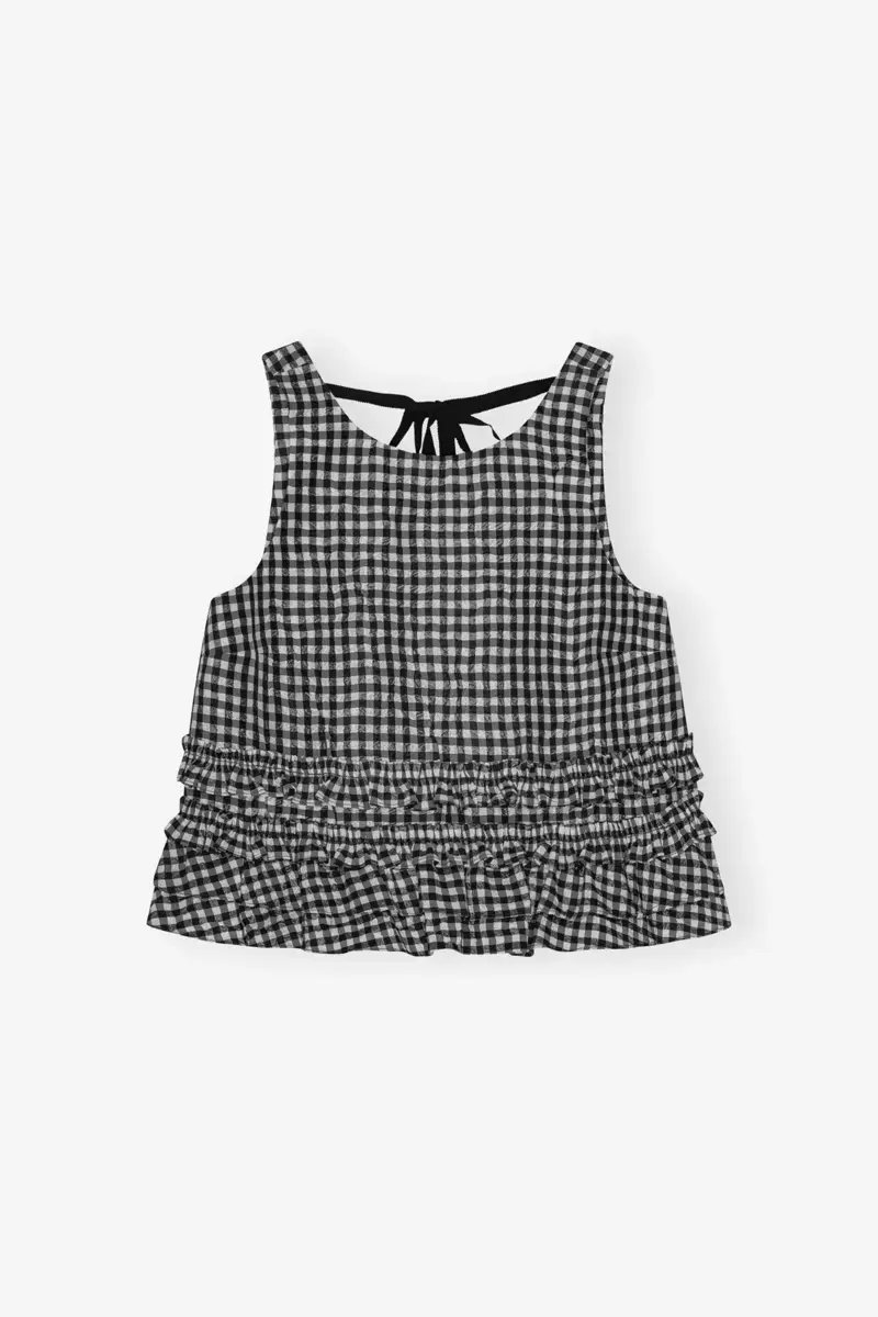 This top features a black and white check pattern and crinkled texture. The top is designed with an open back, tie string and frill details.