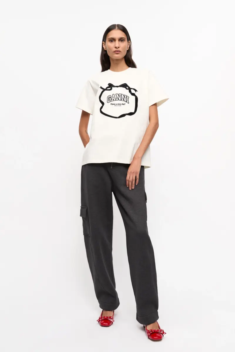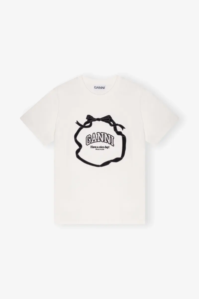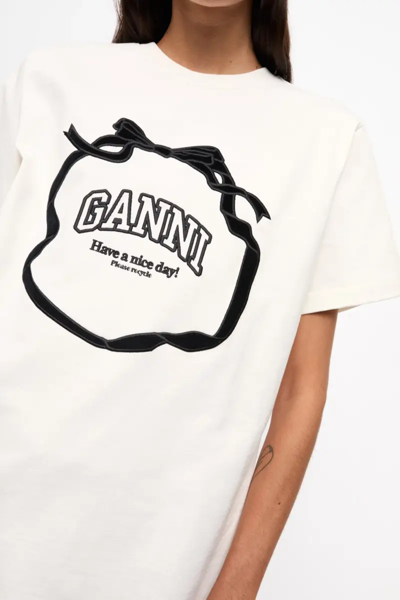 This T-shirt features a crew neckline and short sleeves. The T-shirt has a printed black ribbon and bow, a GANNI logo, and the phrase ‘Have a nice day! Please recycle.’