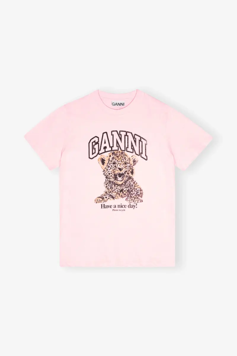 This T-shirt features a graphic of a leopard cub, a GANNI logo and the phrase ‘Have a nice day! Please recycle.’ The tee has a round neckline and short sleeves.