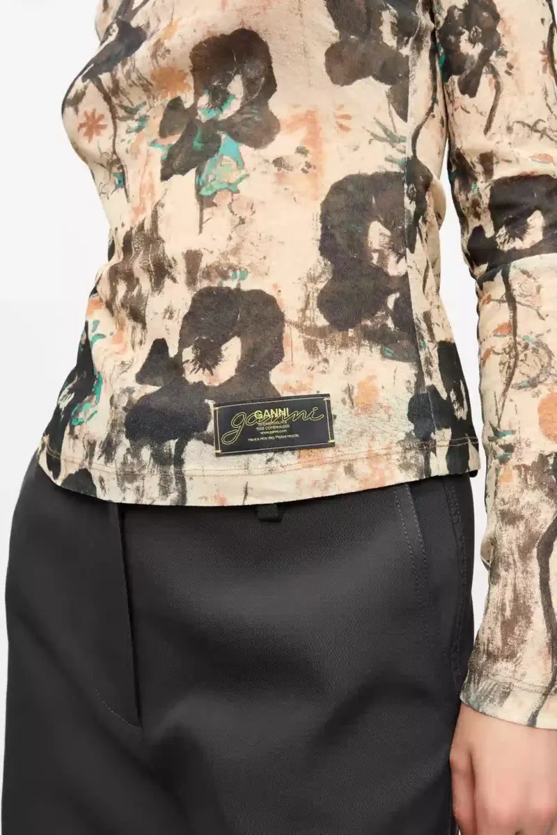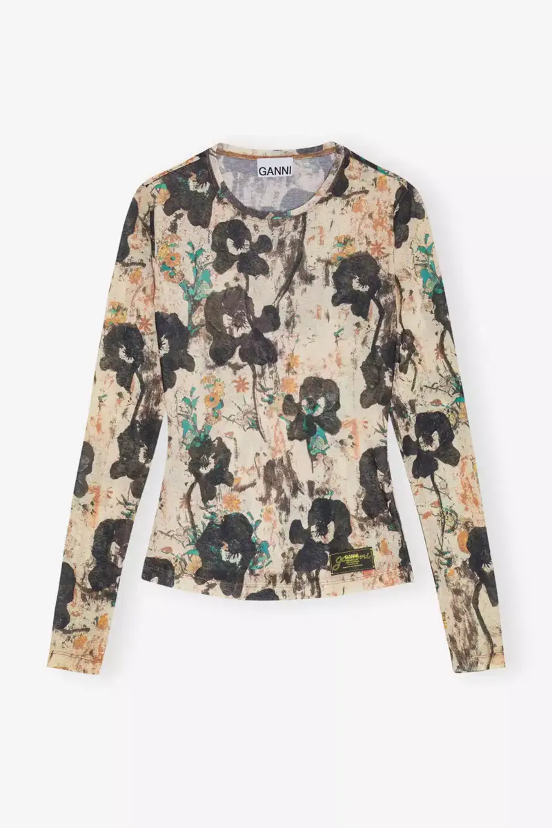 This Printed Marl Mesh Long Sleeve Top features a round neckline, long sleeves and a sewn-on GANNI logo patch.