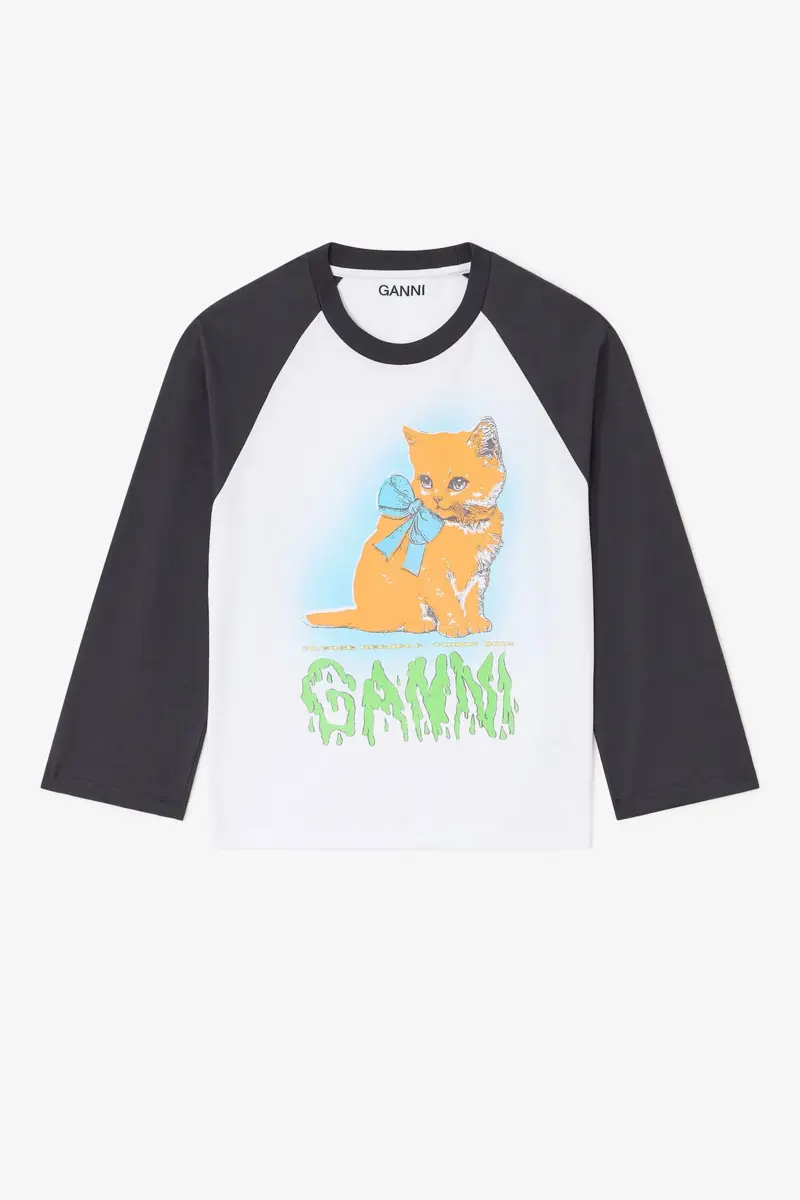 This T-shirt features a round neckline, three-quarter sleeves, and a GANNI logo. The T-shirt has a Kitty print graphic and a ‘Have a nice day! Please recycle’ message.
