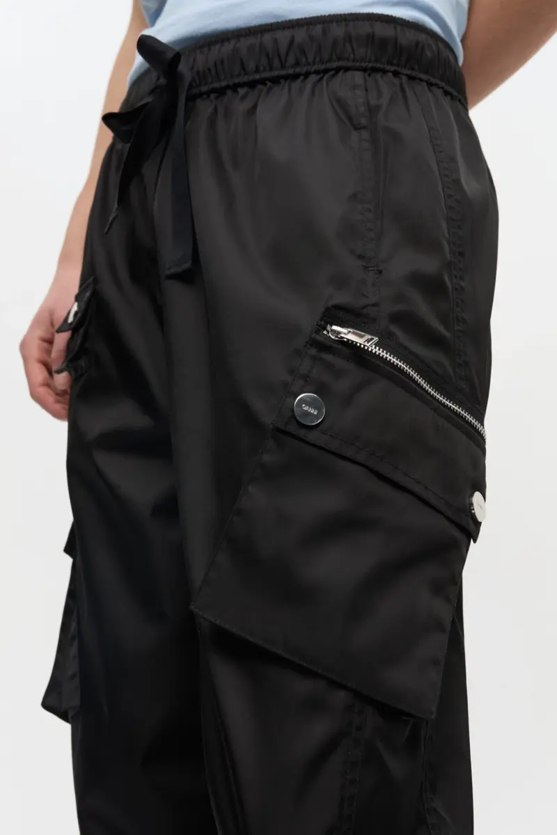 These trousers feature an oversized fit with an elasticated waistband with a drawstring closure. The trousers includes multiple pockets with button and zipper closures.
