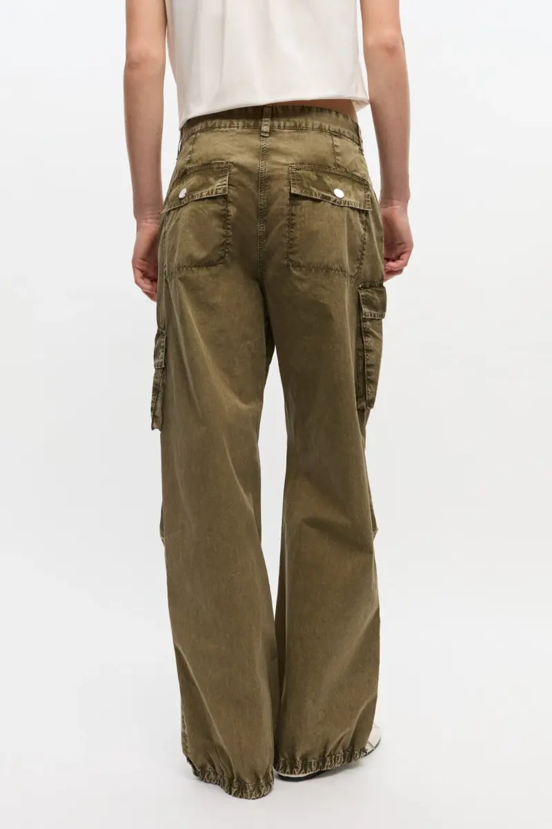 These trousers feature belt loops, a zip and button closure, a small front pocket, two side cargo pockets, back pockets and drawstring at the ankles.